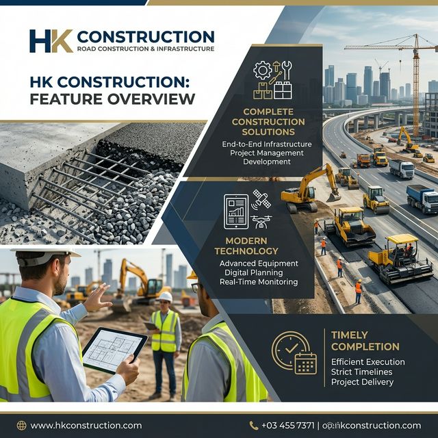 HK Construction is a trusted construction company specializing in infrastructure and commercial development projects. The company provides services for industrial projects, farmhouses, societies, and private sector construction work. Their team is known for completing projects within the committed timeline while maintaining high standards.