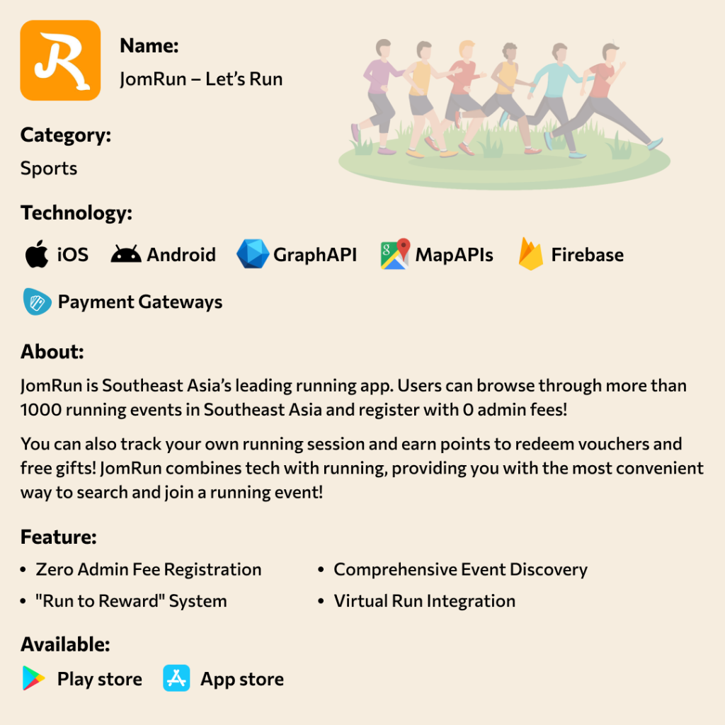 JomRun is Southeast Asia’s leading running app. Users can browse through more than 1000 running events in Southeast Asia and register with 0 admin fees! You can also track your own running session and earn points to redeem vouchers and free gifts. JomRun combines tech with running, providing you with the most convenient way to search and join a running event!